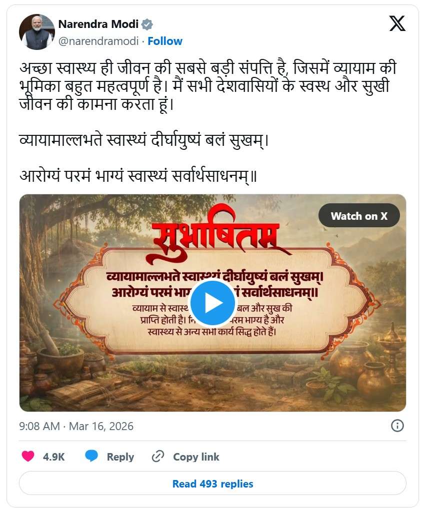 The Prime Minister also shared a Sanskrit Subhashitam that underscores the importance of physical activity: